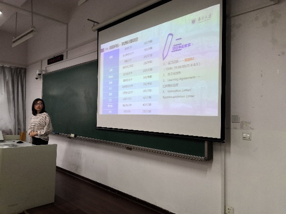 首先,员工交流科科长陈晓清老师对员工出国交换项目进行了总体的介绍。陈老师就南大伙伴大学、出国交换项目类型、南大提供的奖学金、CSC项目等方面作了系统而全面的介绍,并结合往年太阳成集团tyc234cc的数据为同学们分析了学长学姐的出国交换情况,还给同学们分享了国际合作与交流处-员工交流科的网页及一些重要内容。通过陈老师的介绍,同学们对出国交换项目有了一些初步的了解。