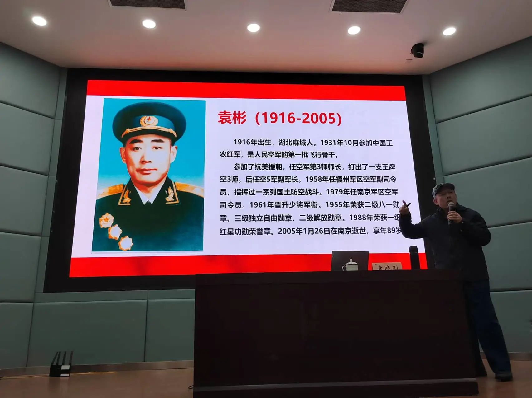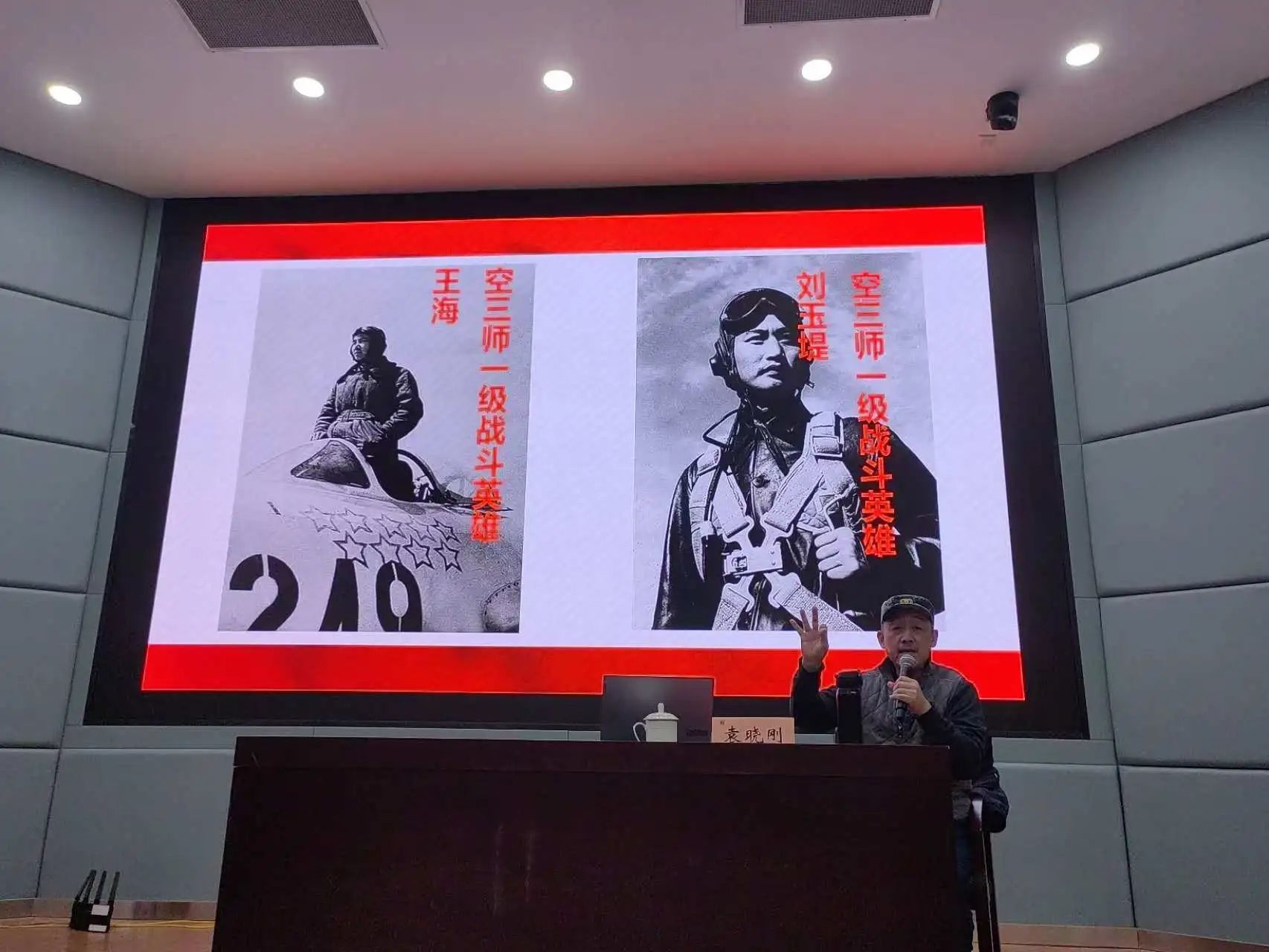 之后,袁大校庄重地为我们详细介绍了那段峥嵘岁月中战场的艰险、空军战士的奋勇无畏,以及那些在幕后默默付出的机组人员的伟大贡献。他提到,在那烽火连天的年代,战场上的每一刻都充满了未知与危险。当时号称“空中堡垒”的B-29盘旋空中,如同乌云压顶,让人喘不过气来。而我军空军战士,凭借着不到20小时的飞行经验,却毫不畏惧地迎难而上,与敌军展开了殊死搏斗。以顽强的意志和坚定的信念,取得了击落美军飞机330架、击伤95架的辉煌战果。