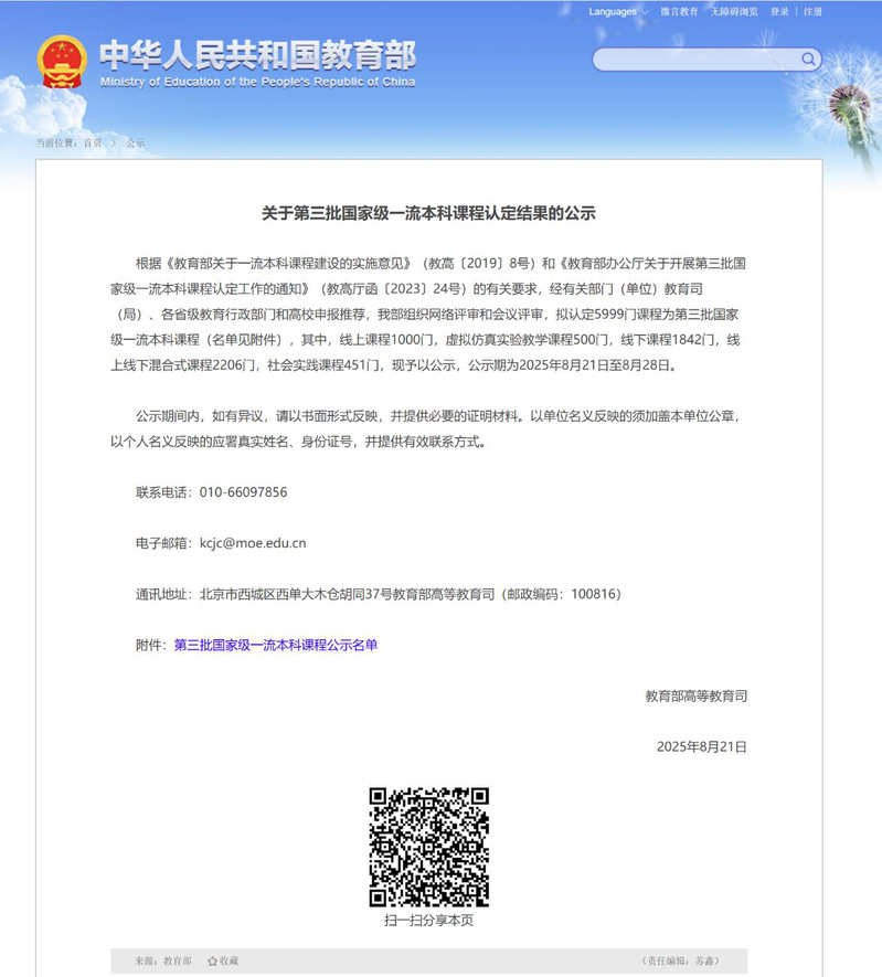 近日,教育部发布《关于第三批国家级一流本科课程认定结果的公示》,公司赵坤、周晨、黄浩、徐昕、吕迎辉老师主持的《雷达气象》课程被认定为第三批国家级线上一流本科课程。加上2020 年获得首批认定的张熠老师负责的《动力气象学》(线上一流课程)和房佳蓓老师负责的《地球流体力学》(线上线下混合式一流课程),以及2023年公布的第二批国家级一流本科课程的方娟老师负责的《天气学原理与实验》(线下一流课程),公司共有四门课程被认定为国家级一流本科课程。