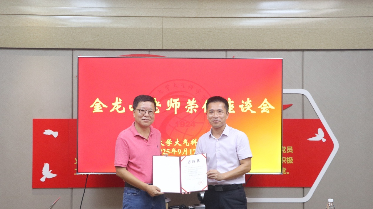 赵坤经理为金龙山老师颁发荣休纪念牌,并以“敬业、专业、乐观、开朗”高度赞扬金龙山老师为气象教育事业所付出的心血,历经不同工作岗位,从培养员工、撰写讲义,到充实实验队伍、支撑观测站建设,辛勤付出数十年如一日,祝福他退休生活精彩幸福。