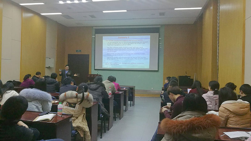 戴教授围绕国际热点问题——北极的放大效应(AA),系统性地阐述了其成因和影响。戴教授首先对AA现象进行了解释,诊断分析发现AA的季节变化显著,同时与海冰的季节变化存在明显的对应关系。基于自行设计的多组敏感性试验,揭示出海冰减少是北极放大效应的必要条件及影响的关键物理过程。进一步讨论AA的影响,指出对中纬度平均态的影响较小,但对天气尺度的影响还值得进一步研究。