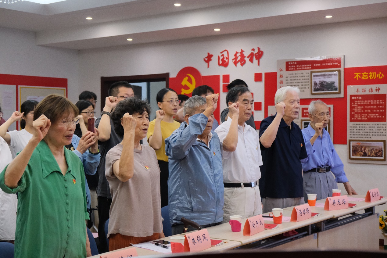 在党委书记潘益农同志的带领下,现场老党员重温入党誓词,新党员进行入党宣誓。党委书记潘益农代表公司党委向获得纪念章的党员同志表示热烈的祝贺和崇高的敬意!感谢他们为公司的建设发展、人才培养和教学科研等方面付出的巨大的心血和汗水,希望青年党员师生要加强党性修养,不断筑牢信仰之基、补足精神之钙、把稳思想之舵,以坚定的理想信念砥砺对党一生的赤诚忠心。以“光荣在党50年”的老同志为榜样,不断锤炼敢于担当的勇气,练就善于担当的本领,自觉扛起实现中华民族伟大复兴中国梦的重担,在攻坚克难中奋勇前行,在勇于担当中实现价值,为建设“第一个南大”不懈奋斗。