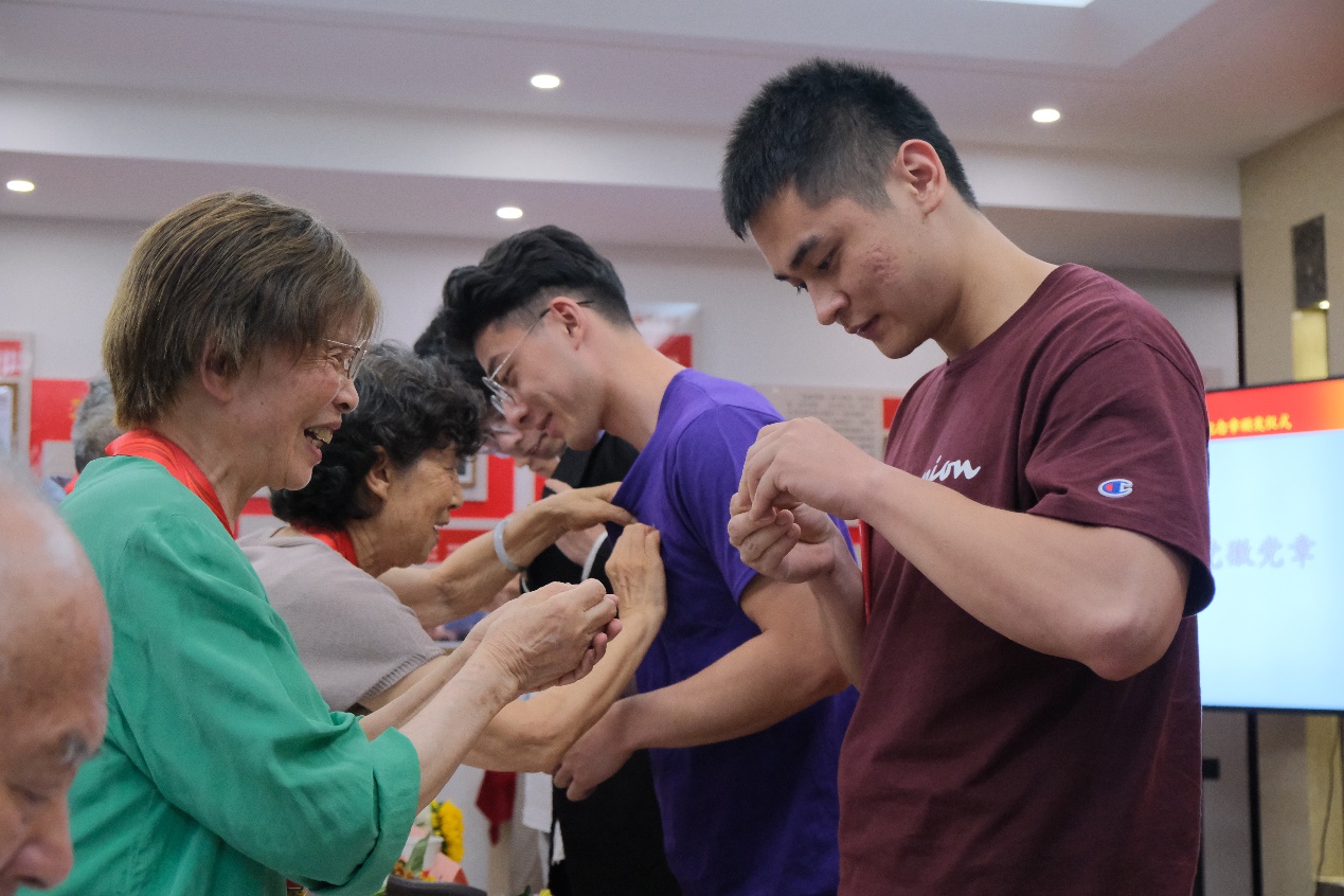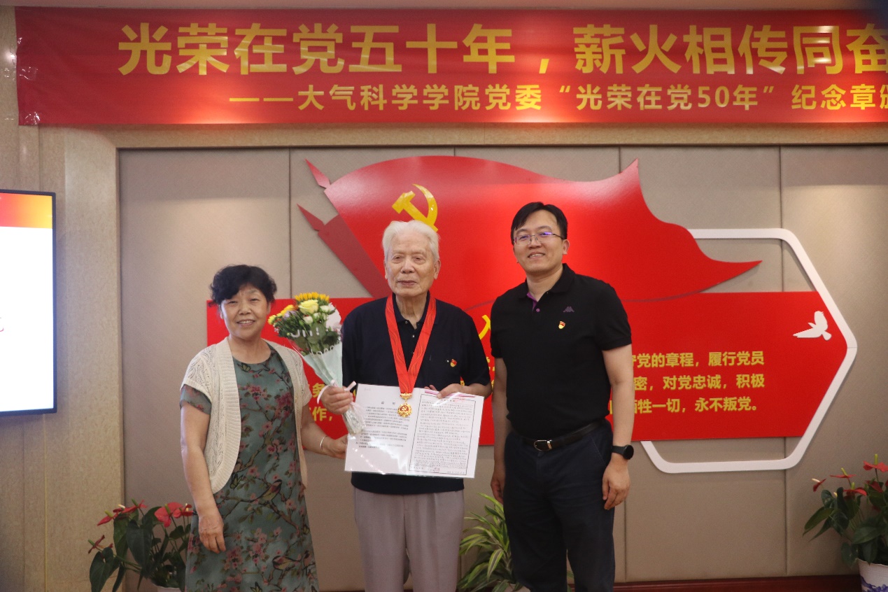 丁爱军经理为光荣在党五十年的老党员颁发了纪念章,退休党支部书记王晓如老师为光荣在党五十年的老党员颁发了纪念品,新党员代表向老党员赠送了鲜花。