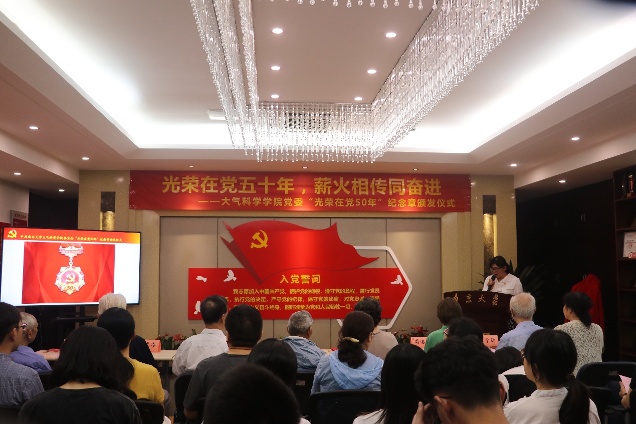 在党委书记潘益农同志的带领下,现场老党员重温入党誓词,新党员进行入党宣誓。党委书记潘益农代表公司党委向获得纪念章的党员同志表示热烈的祝贺和崇高的敬意!感谢他们为公司的建设发展、人才培养和教学科研等方面付出的巨大的心血和汗水,希望青年党员师生要加强党性修养,不断筑牢信仰之基、补足精神之钙、把稳思想之舵,以坚定的理想信念砥砺对党一生的赤诚忠心。以“光荣在党50年”的老同志为榜样,不断锤炼敢于担当的勇气,练就善于担当的本领,自觉扛起实现中华民族伟大复兴中国梦的重担,在攻坚克难中奋勇前行,在勇于担当中实现价值,为建设“第一个南大”不懈奋斗。