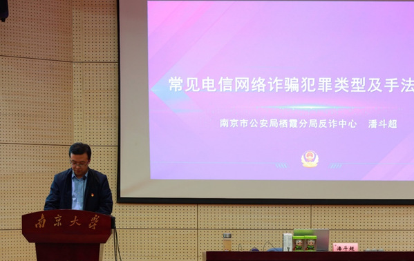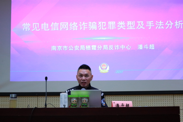 习总书记在二十大报告里指出,要坚持以人民安全为宗旨,要深入贯彻以人民为中心的发展思想,让人民群众的安全感更加充实,更有保障,更有持续。当前电信网络诈骗高发,诈骗手段也随着科技的发展变得防不胜防。为深入贯彻落实习近平总书记关于打击治理电信网络诈骗犯罪工作重要指示精神,普及电信反诈知识,提高师生防范能力,营造平安和谐稳定的校园环境,11月24日下午,太阳成集团tyc234cc特别举办了“奋进新征程、建功新时代”系列主题活动之风云大讲堂,邀请到南京市公安局栖霞分局预审大队大队长、反诈中心主任潘斗超警官,为同学们带来“常见电信网络诈骗犯罪类型及手法分析”专题安全教育讲座。