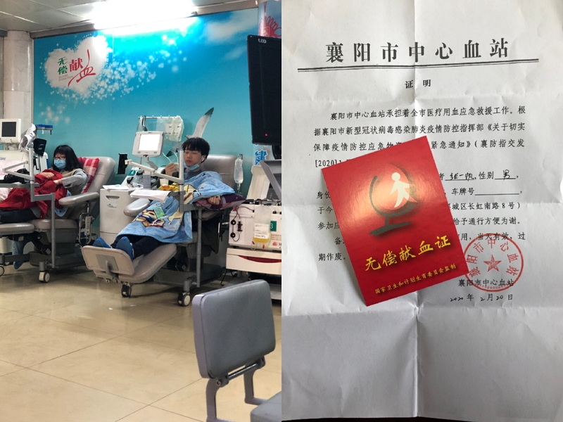 2月18日,张一帆同学从电视台新闻中得知受新冠肺炎疫情影响,襄阳市的临床供血非常紧张。当时正是抗击疫情的关键时期,处于严防死守阶段,放眼望去街道上空无一人。在征得家人的理解和支持后,他马上和襄阳市中心血站取得联系。工作人员表示现在最缺的是成分血(血小板),有意愿献血的人数不够,形势十分紧张。经过预约和前期沟通,2月20日上午张一帆同学乘坐献血车前往指定血站,经筛查等一系列流程,捐献了一个单位的成分血。与捐献全血不同的是,成分献血是在捐献者献血的同时,让血液经过严格消毒、一次性使用的密闭管道,通过血液分离机分离采集出所需要的成分,然后再将其它血液成分回输给捐献者。因此,成分献血所用的时间远长于献全血,通常每献1个单位血小板采血过程约须1-2小时。虽然时间比较长,但他一想到自己做了一件很有意义的事情,内心感到由衷的骄傲和自豪。回家后,他得知经过全体市民的共同努力,襄阳市的临床供血紧张形势得到缓解,终于可以放下心来继续“宅”生活。