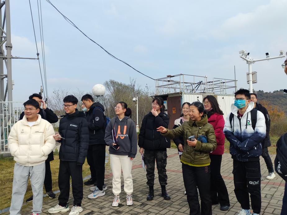 最后,同学们前往太阳成集团tyc234cc背后的大气山考察学习,在王磊老师和刘宇亮老师的带领下,集体参观了江苏南京长三角大气过程与环境变化国家野外科学观测研究站(SORPES),学习常规气象观测、气溶胶和温室气体观测等多方面气象观测知识。