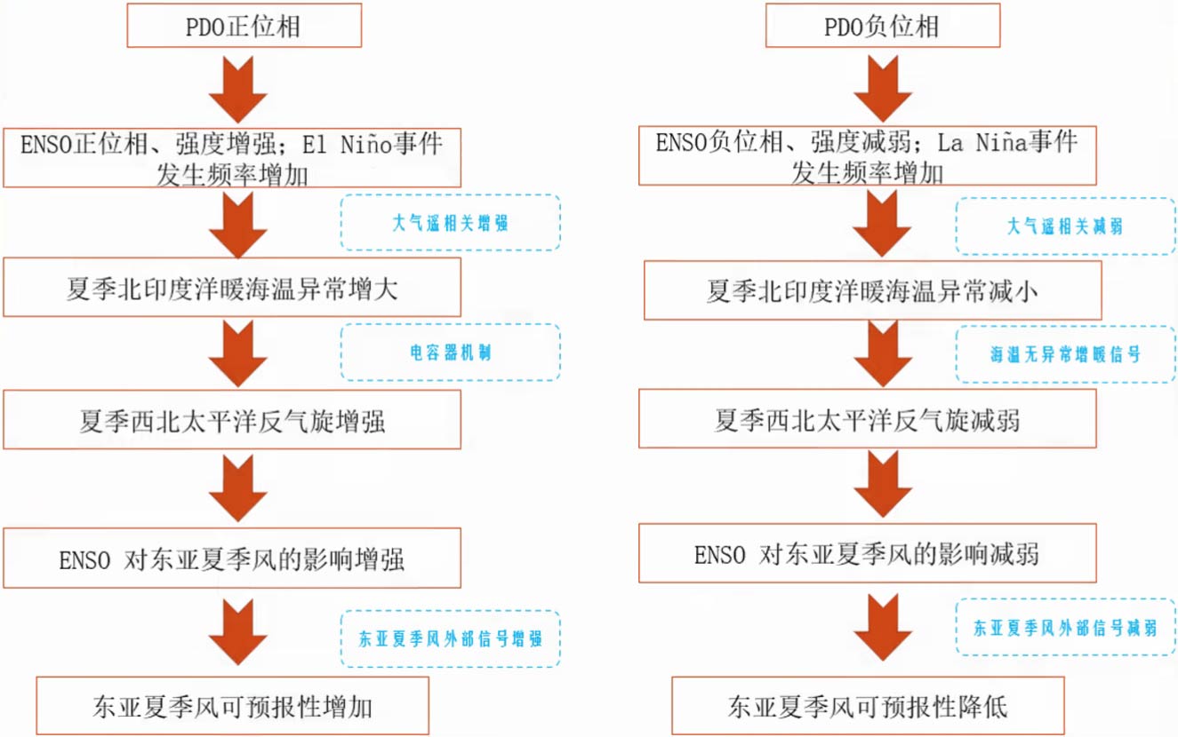 丁老师接着介绍了PDO通过调制ENSO强度来影响东亚夏季风可预报性的机制。当PDO正位相时,厄尔尼诺事件比拉尼娜事件更频繁发生,并导致ENSO变率增强,大气遥相关增强,夏季北印度洋暖海温异常增强,夏季西北太平洋反气旋增强,这使得ENSO对东亚夏季风的影响增强,东亚夏季风可预报性增加。而PDO负位相时情况则相反。