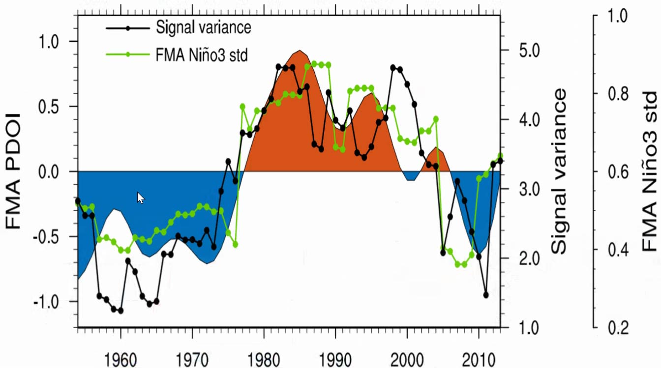在本次学术报告中,丁老师首先介绍了东亚夏季风环流系统,以及近些年东亚夏季汛期降水预测评分的时间演化。东亚夏季风环流系统复杂,季风降水受多方面影响。虽然随着模式的不断发展,短期降水的预报技巧不断提高,但近十几年预报模式的汛期降水预测评分却有所下降。丁老师接着选用信噪比为可预报性的度量方法,将气候变量的年际变率分为“不可预测”的气候噪声,如季节内震荡等,和“可预测”的气候信号,如海温、海冰、积雪变化等,分析了东亚夏季风可预报性,并发现其存在着明显的年代际变化:即1953-1978年和2002-2014年的信噪比相对较低、可预报性较高,而1979-2001年期间的信噪比相对较高、可预测性较低。这与PDO正负位相的转变呈现了一致的年代际变化,即PDO正(负)位相时,东亚夏季风可预报性高(低)。