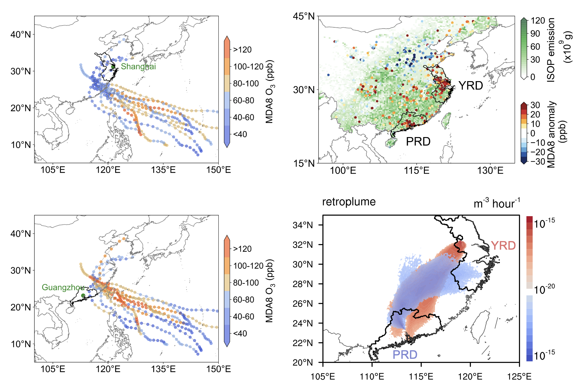 臭氧光化学污染是当前我国夏秋季节的主要大气环境问题,在西北太平洋台风登陆前,我国沿海城市群经常会出现区域性的多日臭氧重污染。丁爱军教授团队与谈哲敏院士合作,基于多年台风路径和臭氧观测,发现当台风路径经由西太平洋低纬地区北上跨越台湾海峡时会导致长三角和珠三角先后出现区域性臭氧污染。利用气象-自然源-化学耦合模拟,发现台风外围高温和强辐射等条件显著加剧了华南森林挥发性有机物的排放,通过与人为源的相互作用增强两大城市群区的臭氧污染。随着台风的逼近和登陆,两大城市群间的臭氧及其前体物存在显著的上下游输送关系。