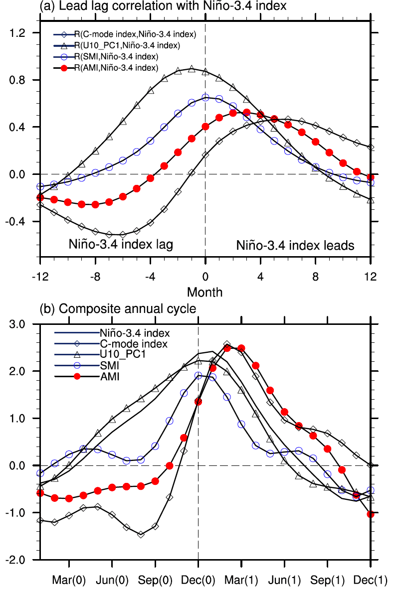 图2.(a)Nino-3.4指数与C-mode指数(方块线),热带太平洋纬向风第一模态时间系数(三角线),对称模态时间系数(圆圈线)和非对称模态时间系数(红色点线)的超前滞后相关。(b)基于东太平洋型El Nino事件合成的Nino-3.4指数(黑色实线),C-mode指数(方块线)热带太平洋纬向风第一模态时间系数(三角线),对称模态时间系数(圆圈线)和非对称模态时间系数(红色点线)的时间演变。