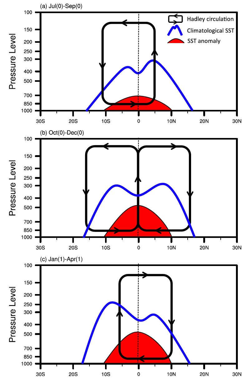 Guo Y. P., and Z. M. Tan,2018: Relationship between El Ni?o-Southern Oscillation and the symmetry of theHadley circulation: Role of the sea surface temperature annual cycle, J.Climate., 31, 5319-5332. doi: 10.1175/JCLI-D-17-0788.1.