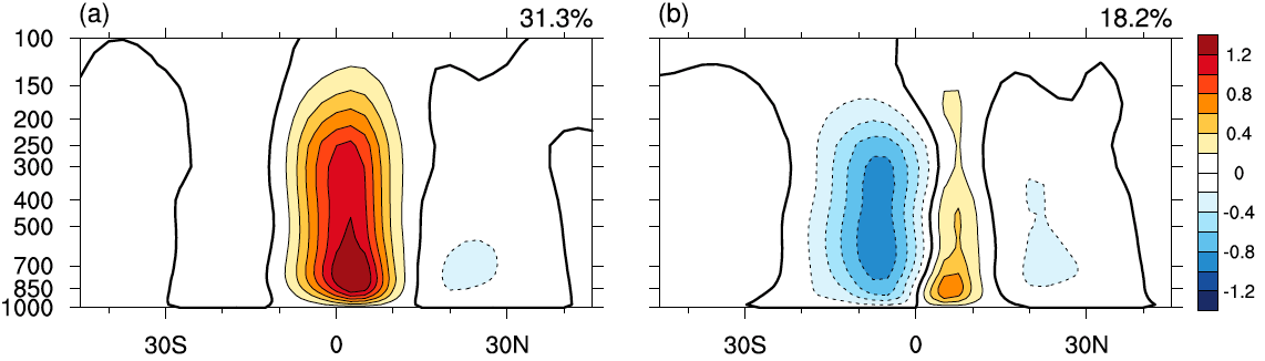 图1. (a)Hadley环流第一主导模态,(b)Hadley环流第二主导模态。右上角数值表示解释方差。