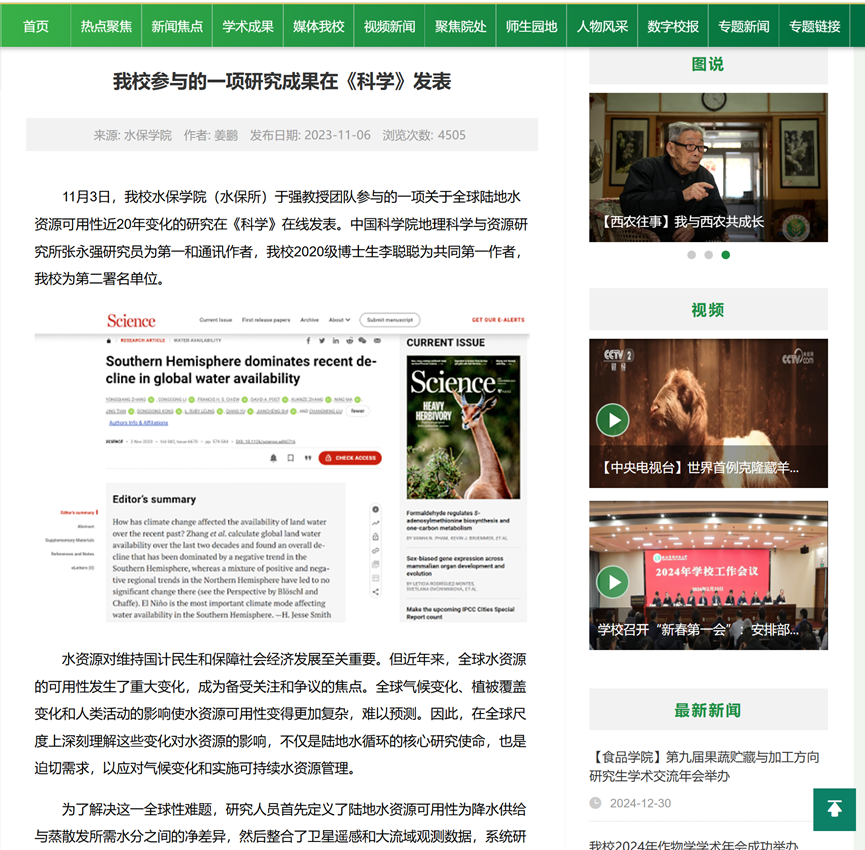 (1)施宇博士,在读期间推荐到美国奥本大学联合培养,在田汉勤教授共同指导下,开展了生态系统碳氮过程、土地利用变化和粮食安全等方面的研究,成果在Nature Food等期刊发表,现为北京大学博雅博士后。(2)李聪聪博士,在中国科公司地理资源所张永强研究员直接指导下,开展了全球水资源可利用性和气候变化的研究,并赴澳大利亚科工组织合作研究,成果以共同一作发表在Science期刊,毕业后入选国家博新计划。(3)赵杰博士,入学后痴迷于林火对气候系统的反馈作用。后来岳超研究员从法国回来,他对林火的生态问题在全球尺度上做过深入研究。我对赵杰说,你到岳老师那里做开门弟子吧!经过多年的努力,他们成就了西农在Nature期刊上的第一篇论文。赵杰那时候管理了一个QQ群,据说有3000多人,叫做自然科学群,可见其胸怀远大。