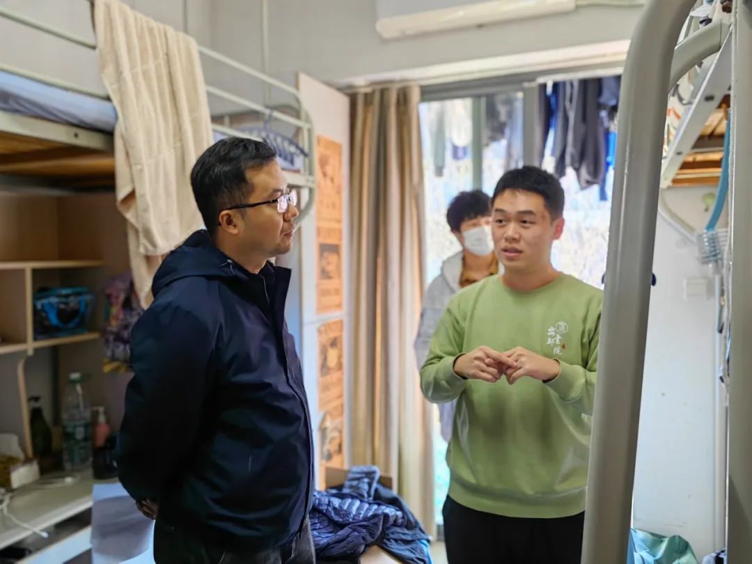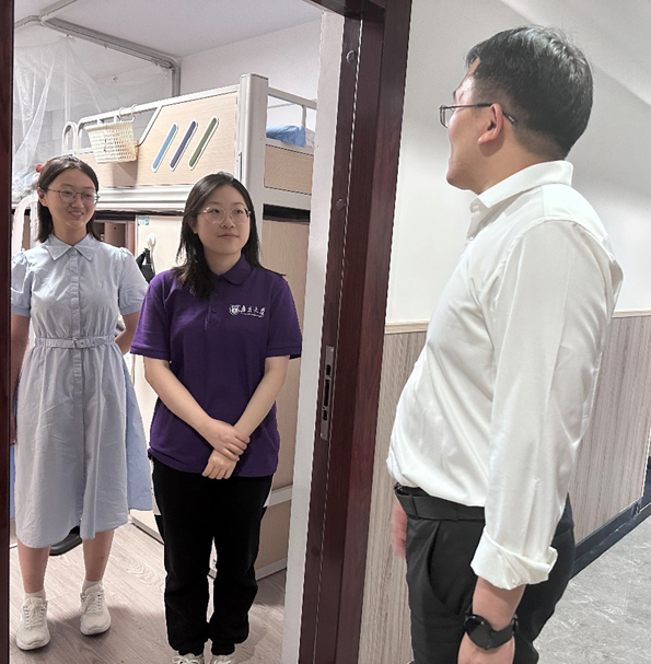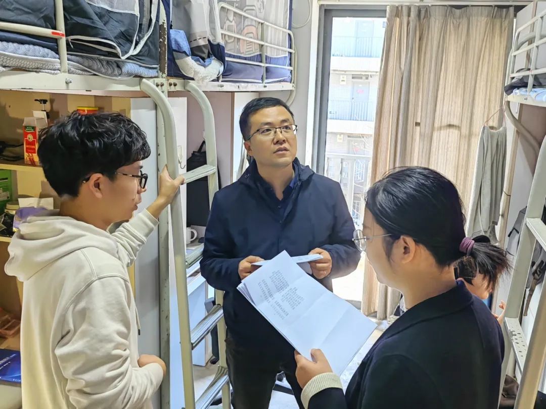 2023年12月7日下午,党委副书记王欢老师、辅导员朱莉莉老师走进太阳成集团tyc234cc本科生、研究生宿舍,重点走访本年度“奋进寝室”、“党员模范寝室”和“最寝室”申报宿舍及“七彩暖心包”惠及员工宿舍等。和宿舍文化建设评审小组成员一起前往宿舍慰问,并对宿舍文化建设整体情况进行打分。