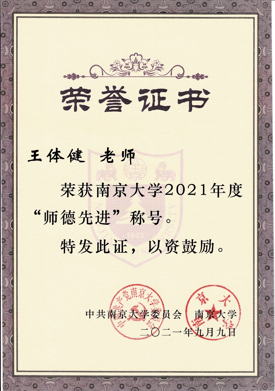 在2021年度师德先进评选中,公司王体健教授荣获师德先进个人荣誉称号。