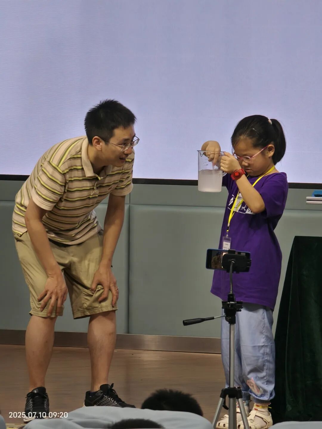 课堂上,傅老师用通俗易懂的语言解释了大气对流的原理,并通过烧杯小实验让小朋友们直观地看到了流体的变化。小朋友们目不转睛地盯着烧杯中翻滚的“对流云”,惊叹声此起彼伏。