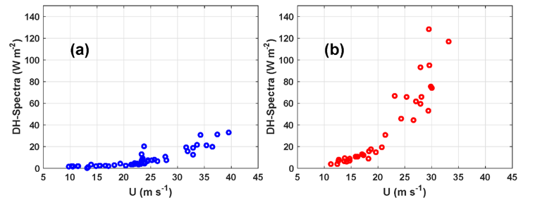 图2运用标准湍谱的方法计算的耗散热能随平均风速的变化,(a)台风黑格比(2008),(b)台风灿都(2010)