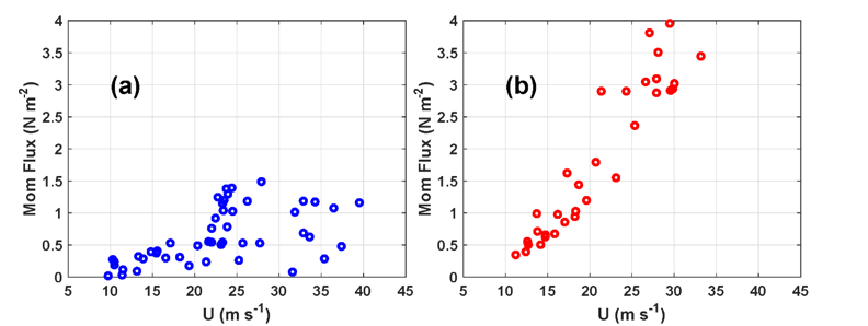 图1动量通量随平均风速的变化,(a)台风黑格比(2008),(b)台风灿都(2010)