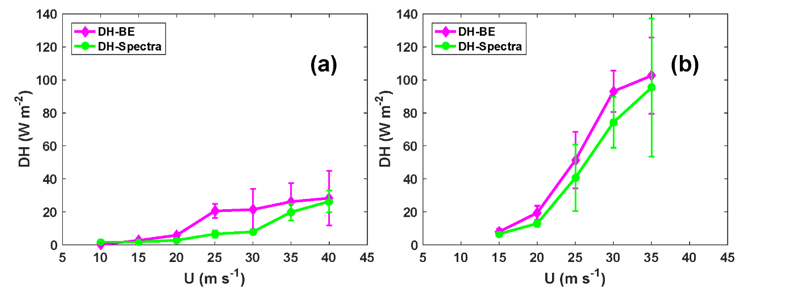 图3表面层理论方法(洋红色)和标准湍谱方法(绿色)计算的区间平均耗散热能随平均风速的变化,(a)台风黑格比(2008),(b)台风灿都(2010)