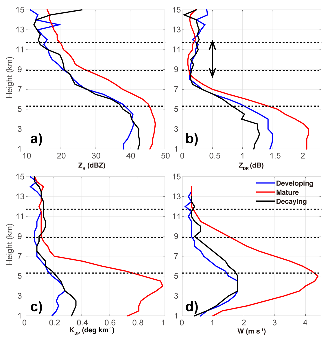 Figure 2. 对流中心的双偏振量中值廓线,a) 反射率因子ZH, b) ZDR,c) KDP和d) 垂直速度。