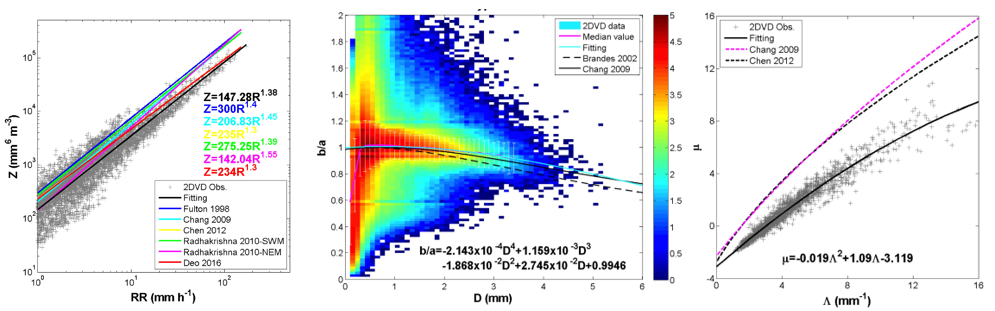 图1. 登陆中国台风的(a)Z-R关系,(b)雨滴形状关系,(c)μ-Λ关系。