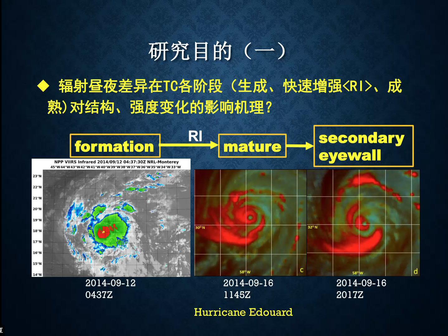 报告开始,唐晓东老师先指出热带气旋强度、结构和降水变化机理是目前大气科学研究领域中的前沿和热点。在梳理了前人对热带气旋的云和降水日变化的相关研究的基础上,唐晓东老师介绍了基于数值模拟和观测资料分析的系列研究,分析了太阳和大气辐射及其昼夜差异在热带气旋生成、快速增强和成熟阶段对其结构、强度和降水变化等的影响作用,并阐明了机理。