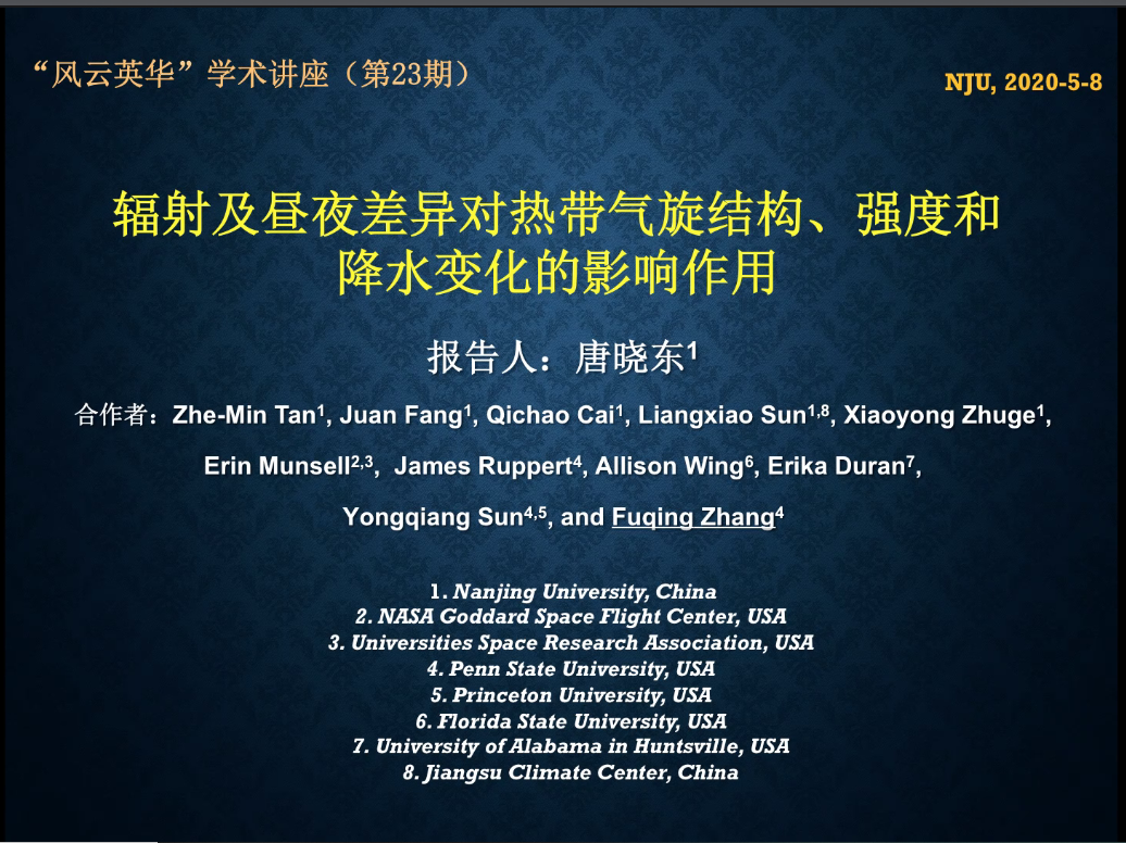 2020年5月8日下午,应公司邀请,公司唐晓东副教授作了题为“辐射及昼夜差异对热带气旋结构、强度和降水变化的影响作用”的风云英华讲座。
