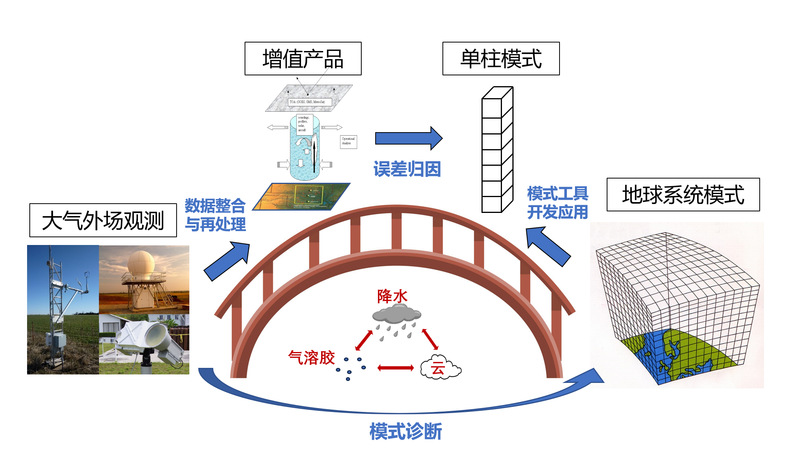 通过大气外场观测与地球系统模式研究大气中的降水、云、气溶胶及其相互作用,具体包括: