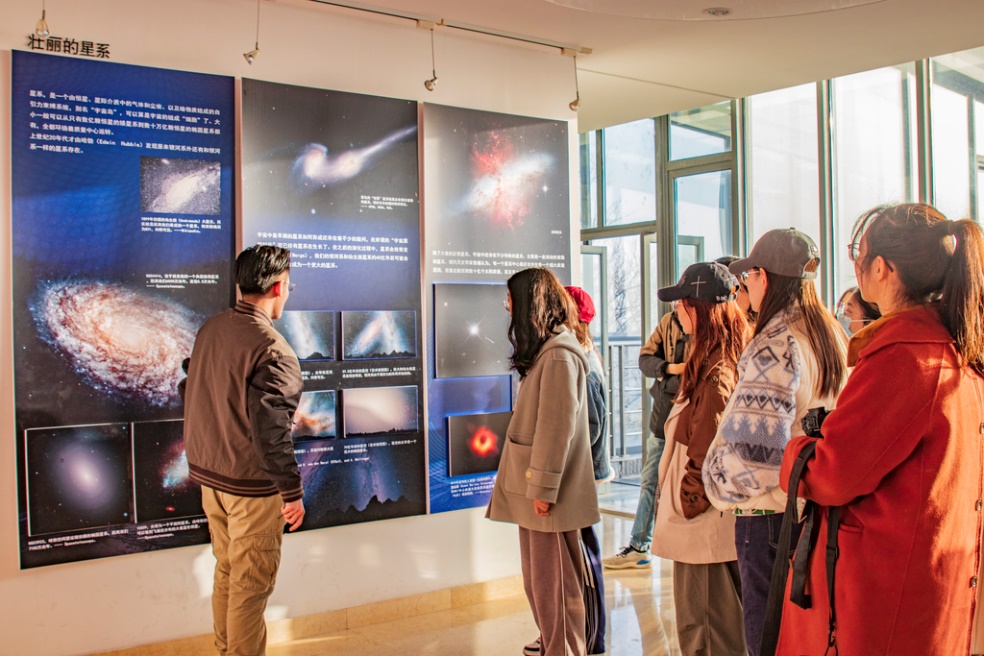 在志愿者的带领下,同学们移步左涤江天文展厅,了解天文现象在地球上的表现和记录,元素的聚集和形成、有限四维宇宙的理论等天文知识。同学们的视线由此从百十公里高空的风云变幻引向了无边无际的浩瀚宇宙。