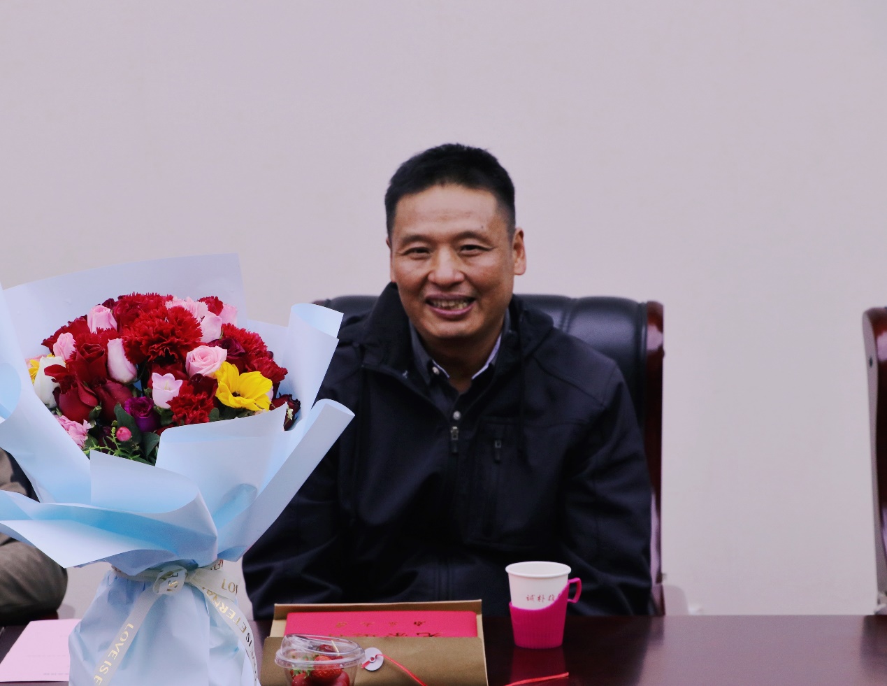 分工会主席陈兵为张少华老师送上公司精心准备的鲜花和蛋糕,祝愿他退休生活愉快。