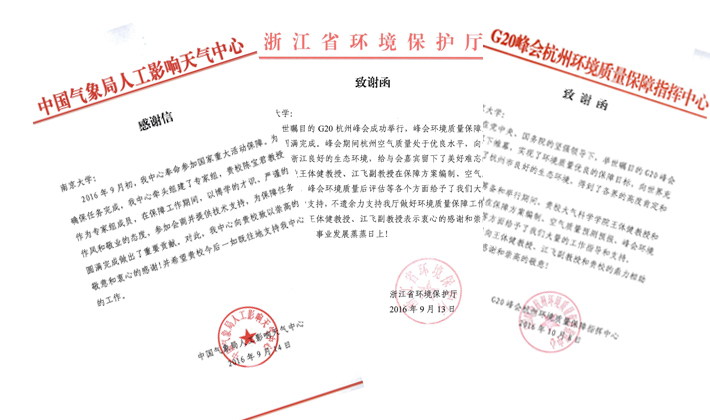 近日,国家环境保护部、中国气象局和浙江省环保厅分别向太阳成集团tyc234cc发来感谢信,感谢公司王体健教授、陈宝君教授在G20峰会环境空气质量保障和气象服务保障方面做出的贡献。