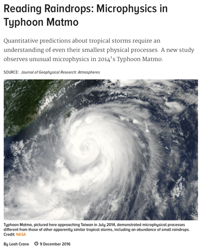 参考文献Crane, L. (2016), Reading raindrops: Microphysics in Typhoon Matmo, Eos, 97, doi:10.1029/2016EO063821. Published on 09 December 2016.