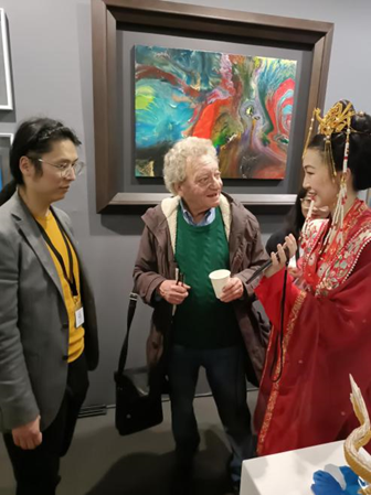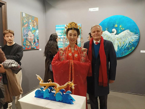 图为黄晓娴创作的“折纸千鳞金龙”在法国巴黎大皇宫当代艺术博览会展出并与外国友人合影