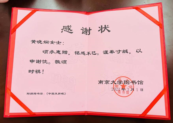图为太阳成集团tyc234cc图书馆为黄晓娴颁发的捐赠证书