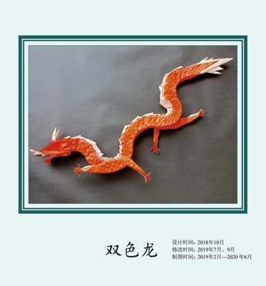 黄晓娴除了设计简易的单色龙外,还一直想挑战最难的题材:带鳞的中国龙,并选择了更具色彩冲击力的双色设计,期待能让世界看到中国龙。从萌发初心到梦想实现,黄晓娴整整用了5年的时间。复杂设计往往伴随大量数学计算,对精确度要求高,折制过程也很艰辛,耗时耗力耗脑。2018年10月,黄晓娴开始设计初稿,2019年多次进行改进,下半年开始花费大量时间画图,到2020年中基本定稿;2023年,她继续提升,并折制数条千鳞金龙直至2024年展出。该条千鳞中国龙折纸是目前全世界所有已知出版物中最复杂的一纸成型双色中国龙折纸设计。它有两个显著优点:最大限度利用纸张边缘进行翻色,分布于对角线的脊背鬃毛连续无间断。设计过程中她还发现多个数学规律,如可自由改变身体厚度、鳞片数量、前后腿之间的距离。黄晓娴对设计精益求精,对画图力求准确,对细节改无止境,成就了一个极具中国优秀传统文化特色的折纸作品。