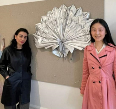 图为黄晓娴的晚礼服折纸作品及与Bahareh Ardakani女士
