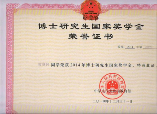 大学二年级时,黄晓娴的大学物理电磁学取得了100分满分的好成绩;大学四年级时,黄晓娴的气象统计预报课程考试取得了98分的总评成绩。硕士一年级时,黄晓娴被聘为南京市昆仑路小公司外科技辅导员,教授中年级小员工气象知识,指导员工的论文最高获得2011年江苏省少年科公司科技创新评比奖项优秀成果奖二等奖、优秀组织奖。在校期间,她获得过雨露奖学金、大气科学系员工会积极表现奖、优秀团员、人民奖学金一等奖、光华一等奖学金、优秀研究生、大气环境研究中心特别贡献二等奖、研究生优秀奖学金、国家奖学金等多项荣誉。