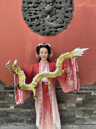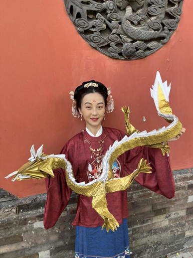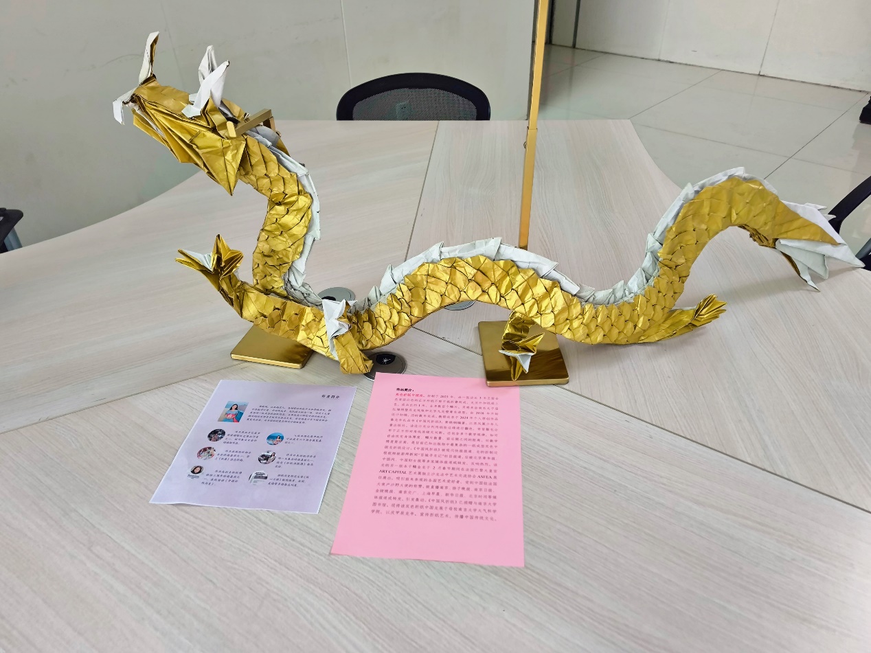 2024年2月13日至18日,出自公司2006级员工黄晓娴之手的折纸艺术作品“折纸千鳞金龙”在法国巴黎大皇宫当代艺术博览会展出。当天,身穿汉服的她,与熠熠金龙交相辉映,吸引了众多外国参观者关注中国“龙”文化。黄晓娴折的纸龙通体金色,内有铁丝支撑,可自由改变龙的身体厚度、鳞片数量、前后腿的距离。而这条纸龙,是由一张边长1.4米的方纸不剪不裁折叠而成的,龙的鳞片多达约1600枚。在金龙摇曳的光影中,在外国友人的惊叹声中,在黄晓娴灿烂的笑容里,她的折纸艺术人生正慢慢向我们展开。