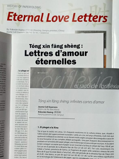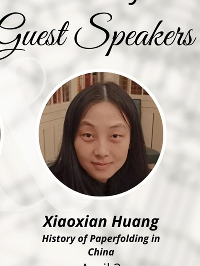 此外,黄晓娴还收集整理中国折纸历史文化资料,关于传统折纸模型“同心方胜”的长篇文章接连发表于西班牙加泰罗尼亚数学协会杂志《NouBiaix(新观点)》2020年第47期、法国折纸运动协会杂志《Le Pli(折叠)》2022年第164期、美国折纸协会杂志《The Paper(纸)》2022年第140期。对折纸历史的出色造诣使得黄晓娴受邀成为2023年乌拉圭折纸博物馆3周年开幕式嘉宾,在线演讲《中国折纸历史》。精彩的演讲吸引了来自世界各地的折友,崭新丰富的内容刷新了外国友人对折纸艺术的了解,加深了西方对中国折纸历史和中国优秀传统文化的认知。