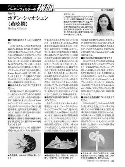 一路走来,黄晓娴播撒折纸艺术的种子,让更多的人了解了折纸艺术的魅力,更走出了国门,让外国友人一睹中国折纸艺术的风采,享受折叠之趣,深深感受到中华民族优秀传统文化之美。作为美的传播使者,黄晓娴将部分优秀作品绘制折叠步骤图投稿至国外折纸杂志,被多国请为国际特邀嘉宾参加折纸年会展览作品并进行讲座教学。如作为法国折纸运动协会年会特邀嘉宾登上杂志《Le Pli(折叠)》2019年第154期封面;作为日本折纸学会吉野一生基金会特邀嘉宾参加东京第25届折纸侦探团年会,接受杂志《折纸侦探团》2019年第177期专访,作品心心相印(天鹅版)被选为年会徽章,作品仙鹤被选为折纸年册封面。