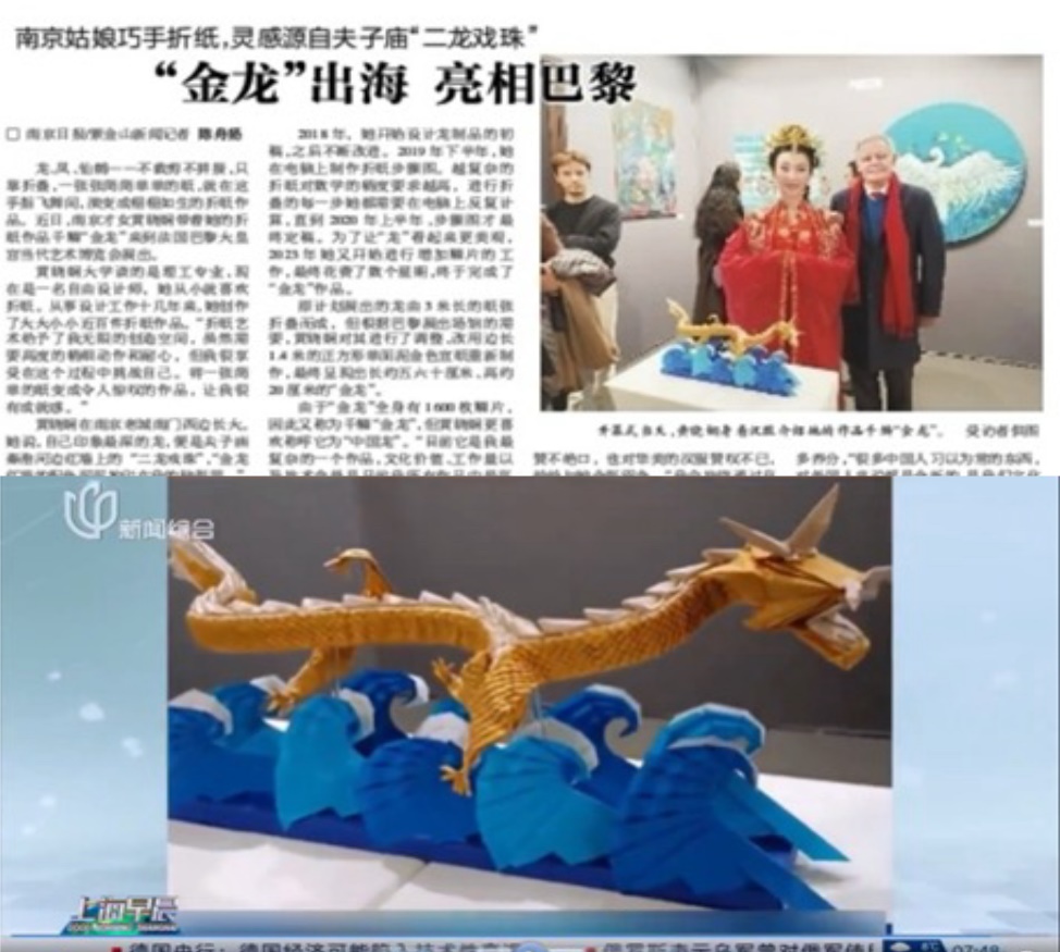 今年2月春节期间,黄晓娴用边长3米单面金色正方形牛皮纸折的1米巨龙在北京首都图书馆、太原并州月美术馆展出,边长1.4米单面泥金色正方形宣纸折的半米小龙在法国巴黎大皇宫ART CAPITAL艺术展独立沙龙法中艺术交流协会ASFEA展位展出。ART CAPITAL历史悠久,其中独立沙龙拥有140年历史。黄晓娴特地穿着凤冠汉服出席大皇宫开幕式,与前来参观的各国艺术家、艺术爱好者热烈交流。前蓬皮杜博物馆策展人著名艺术评论家Yves Kobry先生、公民预备役指挥官荣誉勋章获得者法国陆军高级将领兼艺术家Philippe De Lestrange教授对黄晓娴的折纸中国龙称赞不已。中国驻法大使卢沙野与中国驻联合国教科文组织代表王盈在展览期间亲临现场,对中国艺术家们的参展作品予以高度评价。《中国风折纸》和折纸中国龙接连被现代快报、澎湃新闻、北京青年报、南京电视台、扬子晚报、南京日报、金陵晚报、上海电视台、南京交通广播电台等多家媒体报道,还被欧华报、中国新闻网、中国妇女报、南京发布、我苏特稿、新华日报、北京电视台北京时间等多家媒体转载。
