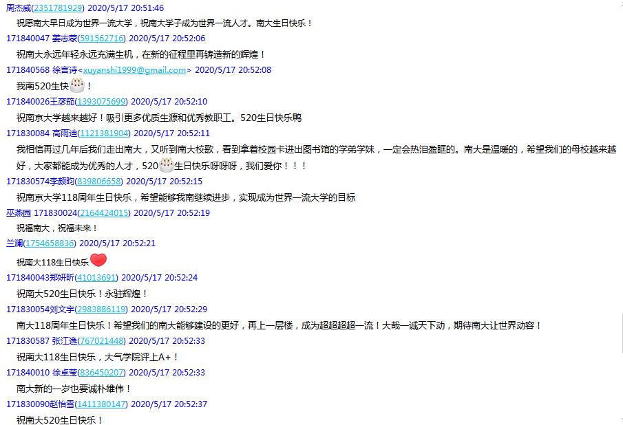 最后,广大团员青年也纷纷在线献出了对南大118岁生日的真诚祝福。本次团生活动最终在校歌的优美旋律之中落下了帷幕。我们广大气象学子,应当以气象大师们为榜样,感悟其先进事迹所承载的时代精神,凝聚共同信念,汇聚磅礴力量,以青春之我,创造青春之中国。