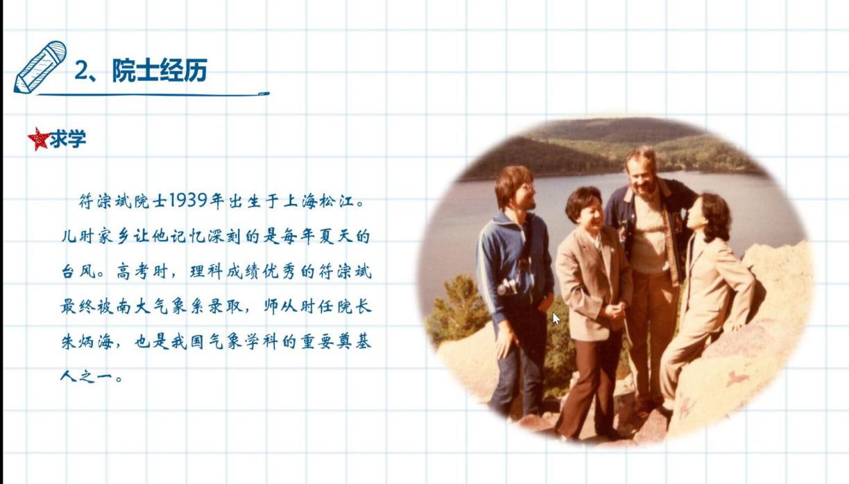 第三部分则是此次团生活动的压轴重头戏,第九小组的三位同学为大家娓娓道来气象大师的感人事迹。竺可桢院士求真务实、以天下为己任,走过了伟大的风云一生;涂长望院士为民主和科学鞠躬尽瘁,救国救民,是吾辈楷模;而符淙斌院士从海气相互作用转向全球气候变化的研究,最终成为该领域杰出的领航者。在听过了三位院士的伟大故事之后,各组同学也展示了自己为母校118岁生日制作的“献礼南大”作品。这些作品形式多样,内容丰富,内涵深厚,表达了他们对母校最真挚的热爱与敬意。
