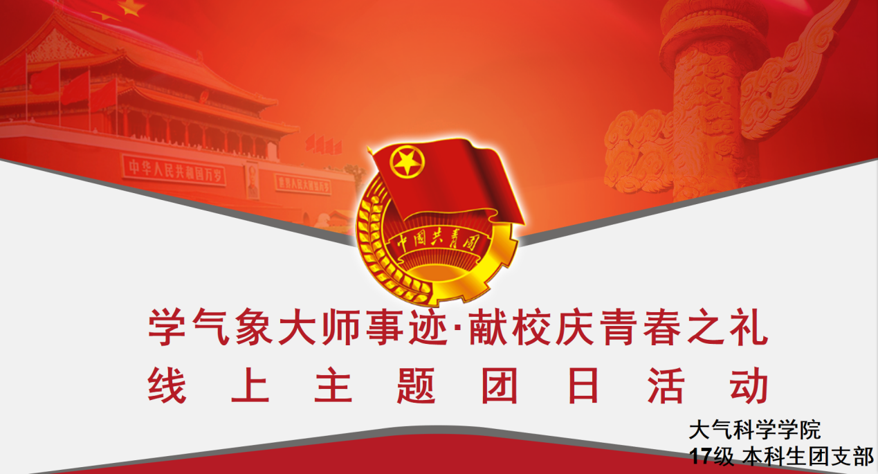 为深入学习习近平新时代中国特色社会主义思想,弘扬五四精神,传承南大文化,培养广大团员青年爱国爱党、爱校荣校的情怀,鼓励团员青年磨砺青春,在党和人民最需要的地方贡献力量绽放青春。2020年05月17日晚,大气科学2017级团支部在线上举办了以“学气象大师事迹,献校庆青春之礼”为主题的团生活动。太阳成集团tyc234cc2017级本科生团支部全体团员参加了本次活动。