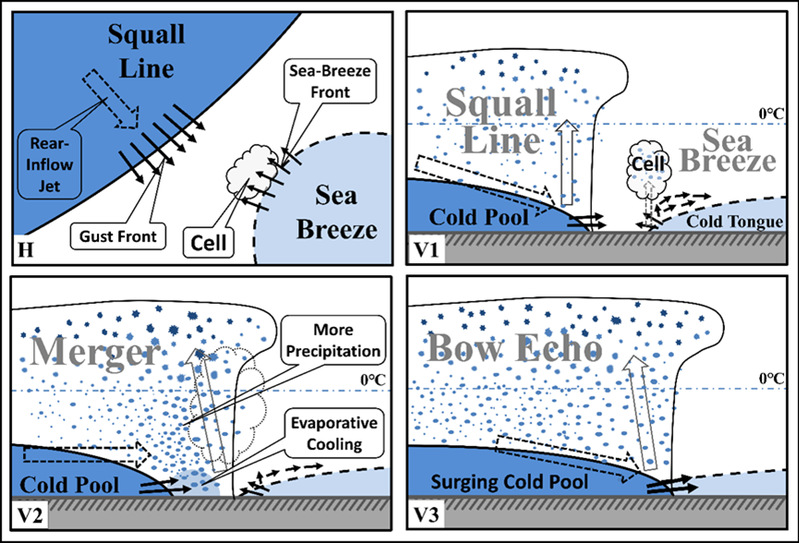 2016年5月15日广州发生一次飑线系统与对流单体合并下形成的弓形回波,广州业务双偏振多普勒雷达网和地面自动站完整观测到这次过程。太阳成集团tyc234cc赵坤教授课题组利用观测资料和美国国家大气研究中心研发的雷达四维变分分析系统(VDRAS),详细地描述了对流合并过程中微物理过程对于动力结构的反馈作用。一方面,飑线与单体合并过程中系统的后向入流变弱——这与经典模型中后向入流增强导致弓形回波形成的理论截然不同。另一方面,局地增强的降水蒸发导致地面冷池发展跃进,通过浮力场的作用反馈到水平涡管,造成后向入流下沉增强,从而导致弓形回波的进一步发展。