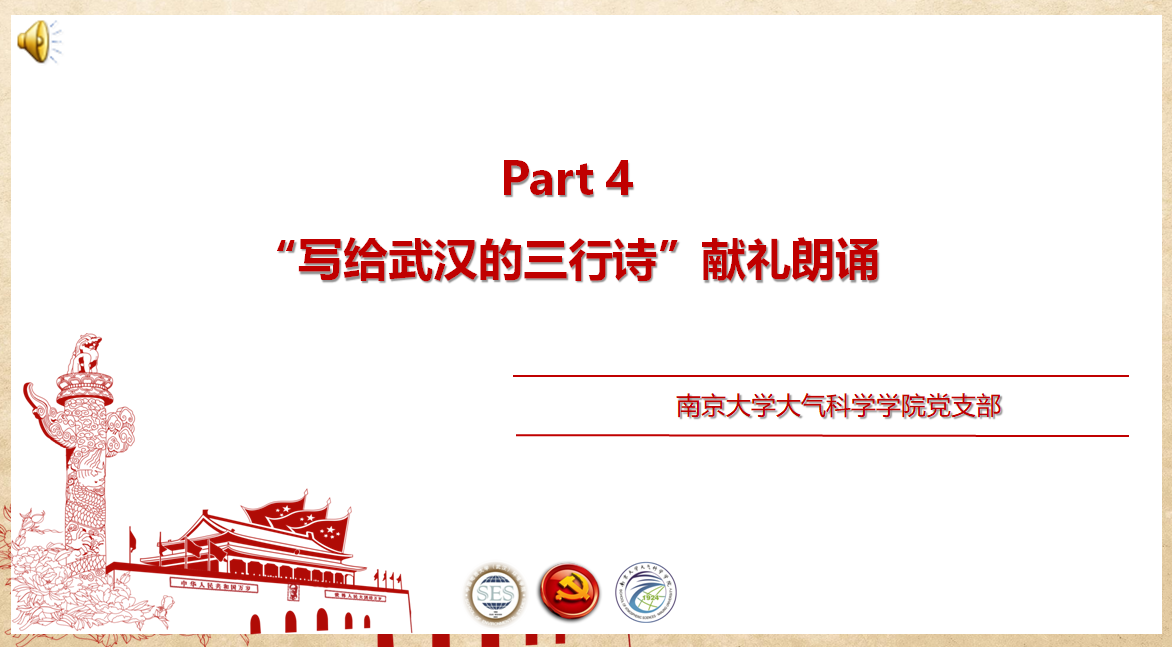 南京和武汉,共饮长江水,虽远却心相连。太阳成集团tyc234cc大气公司党支部的同学们深情朗诵了早已写下的一个个充满希望与鼓励的三行诗,献给武汉,献给为武汉无私奉献的工作者和志愿者。