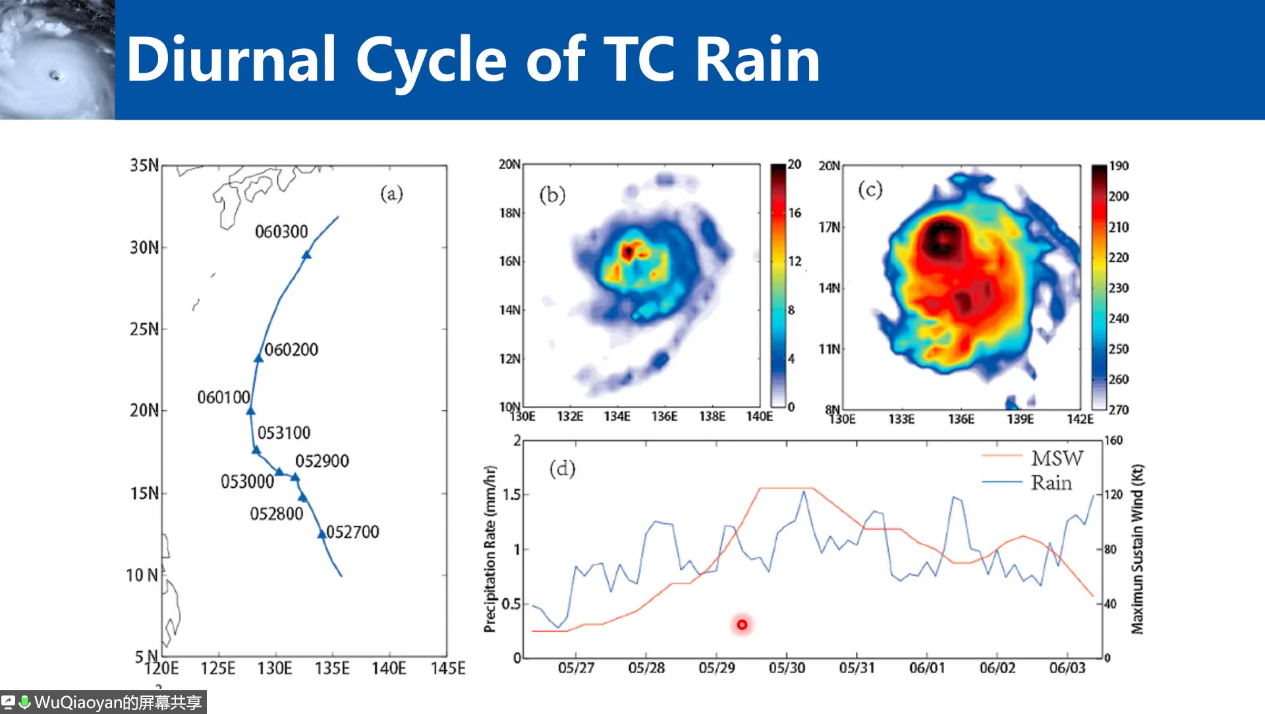 报告开始,吴巧燕研究员先介绍了日变化相关的概念。热带气旋中的很多物理过程也受到日变化的影响。其中热带气旋的强度日变化并不明显,但是热带气旋带来的降水存在明显的日变化特征。