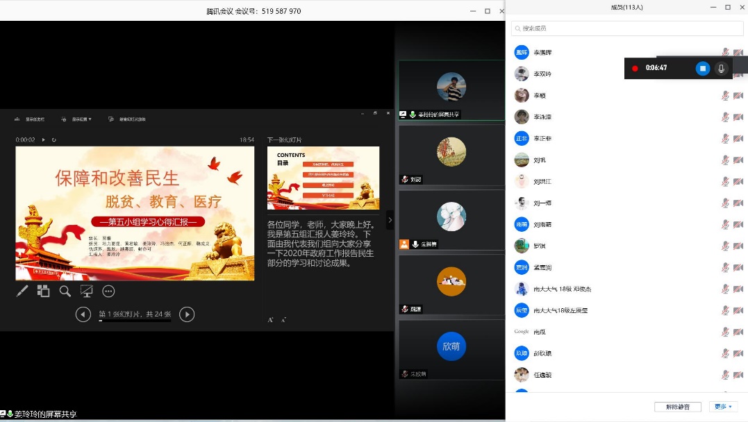 此外,同学们还就香港问题、一国两制、市场改革、环境治理、脱贫攻坚、鼓励科技创新等两会热点话题进行了讨论,根据自己的专业兴趣谈论了土壤、大气污染防治政策措施,调研深入,观点鲜明,体现了当代老员工关心国家社会,敢思考、会思考、有判断、能发声的青年风采。