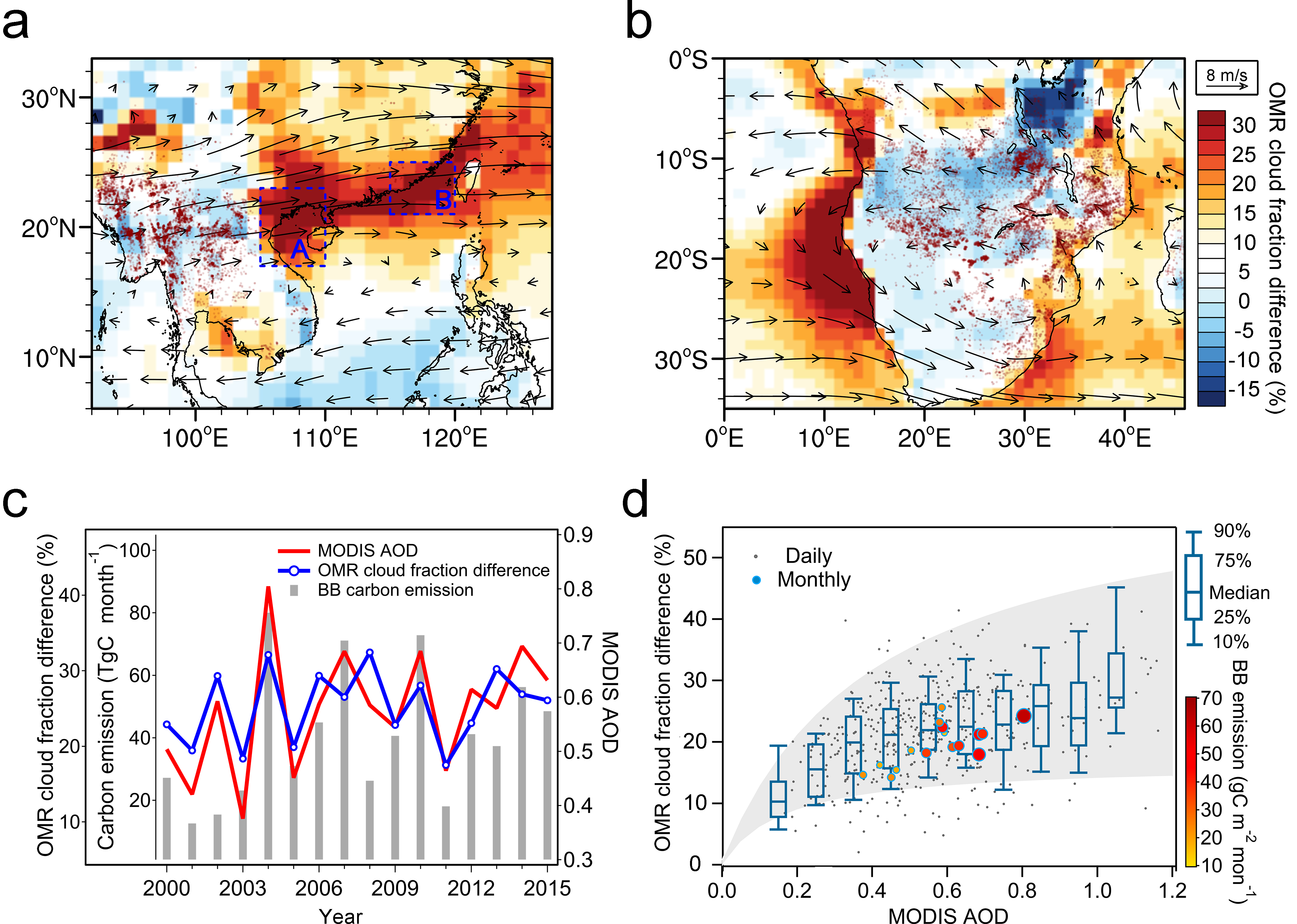图1 基于“观测-再分析差值法”(OMR)获得的东南亚与非洲南部大火所致低云增强以及东南亚地区在不同尺度上低云增强与气溶胶光学厚度的关系